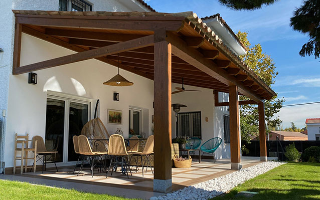Puedes elegir el tipo de madera, el acabado, el color y los complementos como toldos, cortinas o iluminación.